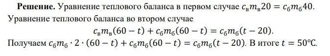 в воду, взятую при температуре 70°с, опустили металлический брусок, температура которого 20°с. после установления теплового равновесия температура оказалась равной 50°с. после этого, не вынимая из воды первый брусок, в воду опустили еще один такой же брусок, температура которого тоже 20°с. какой теперь станет температура воды после установления теплового равновесия? ответ запишите в градусах цельсия и округлите до целого.