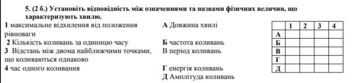 5. (2 б.) Установіть вiдповiднiсть мiж означеннями та назвами фізичних величин, що характеризують хвилю. 1 максимальне відхилення від положення А Довжина хвилі рівноваги 2 Кiлькiсть коливань за одиницю часу 3 Відстань між двома найближчими точками, що коливаються однаково 4 час одного коливання Б частота коливань В перiод коливань Г енергія коливань Д Амплітуда коливань КАРТИНКА ЕСТЬ