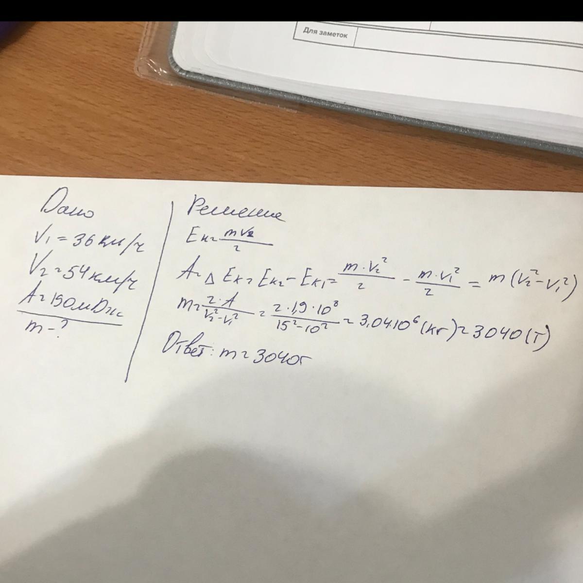Визначте масу поїзда якщо збільшення його швидкості від 54 км/год. до 72 кс /год. електровоз виконав роботу 190 м.Дж