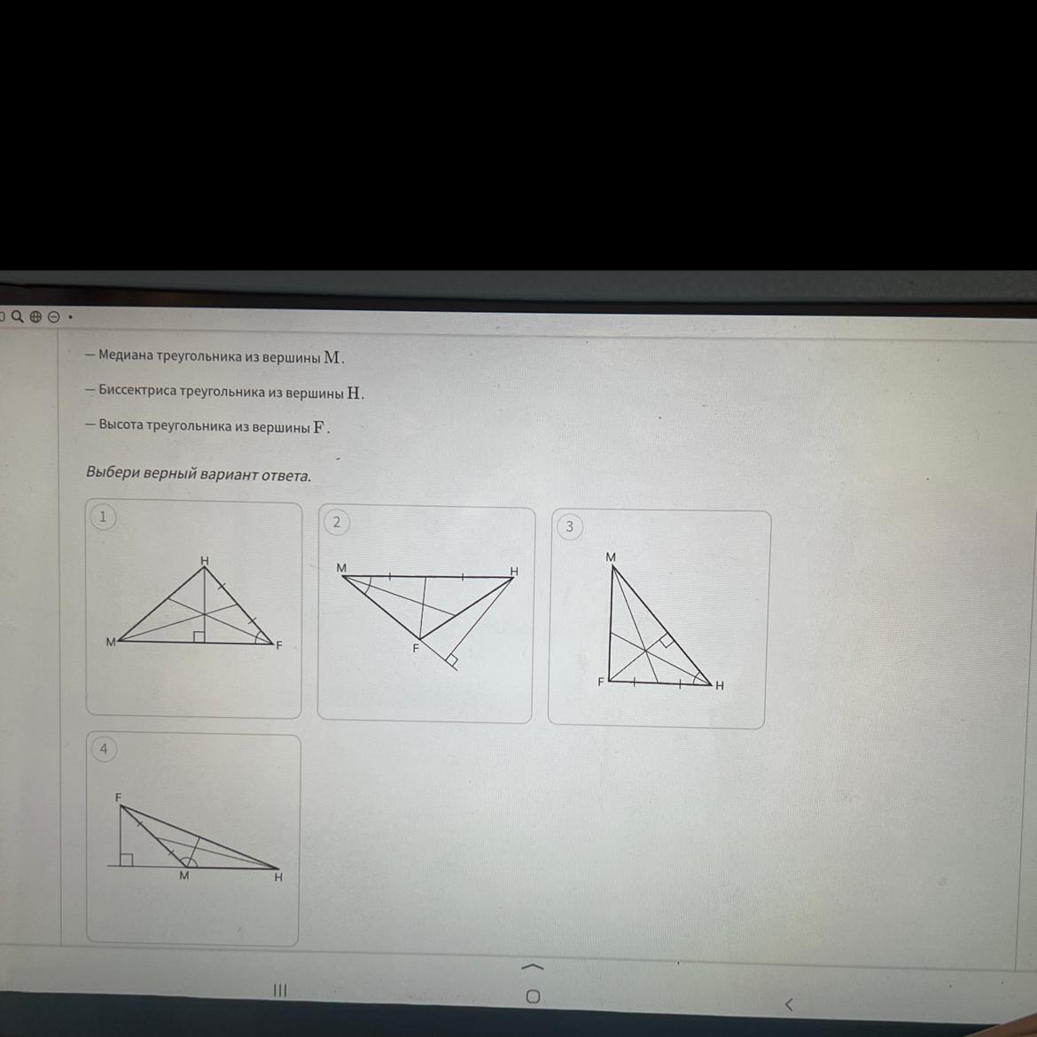 Медиана делит противолежащую сторону пополам, биссектриса делит угол (из которого исходит) пополам, высота - это перпендикуляр опущенный на противолежащую сторону (образует с ней прямой угол).