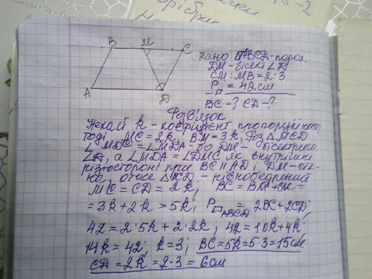 бісектриса кута Д паралелограма ділить сторону ВС на відрізки СМ і МВ так, що СМ:МВ = 2:3 периметр паралелограма дорівнює 42.см знайдіть стррони паралелограма