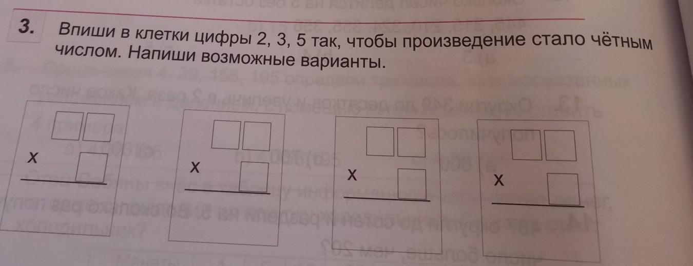 3. X Впиши в клетки цифры 2, 3, 5 так, чтобы произведение стало четным числом. Напиши возможные варианты. X X X