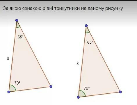 Пояснення: Якщо сторона і два прилеглі до неї кути одного трикутника відповідно дорівнюють стороні і двом прилеглим до неї кутам другого трикутника, то такі трикутники - рівні.