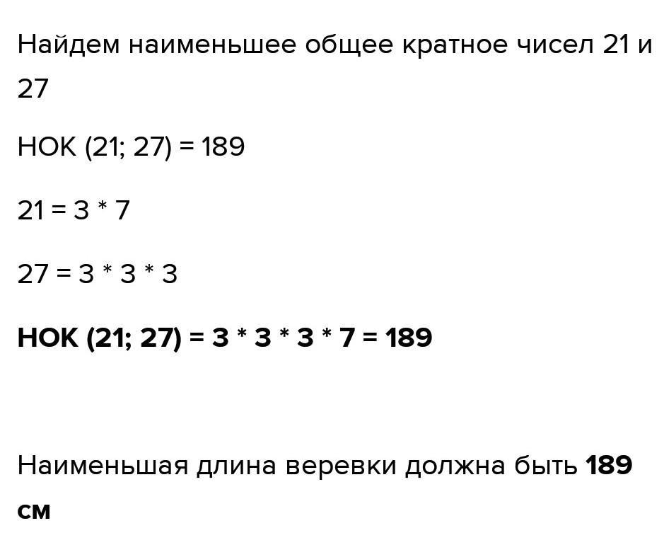 Якої найменшої довжини повинна бути мотузка, щоб її можна було розрізати на рівні частини завдовжки 21 або 27 см без втрат матеріалу (без обрізків),