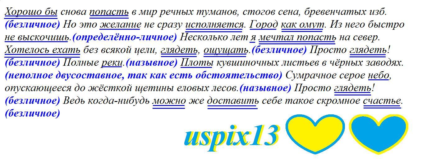 В тексте В. Ф. Тендрякова выделите грамматические основы, определите виды односоставных предложений. Хорошо бы снова попасть в мир речных туманов, стогов сена, бревенчатых изб. Но это желание не сразу исполняется. Город как омут. Из него быстро не выскочишь. Несколько лет я мечтал попасть на север. Хотелось ехать без всякой цели, глядеть, ощущать. Просто глядеть! Полные реки. Плоты кувшиночных листьев в чёрных заводях. Сумрачное серое небо, опускающееся до жёсткой щетины еловых лесов. Просто глядеть! Ведь когданибудь можно же доставить себе такое скромное счастье.