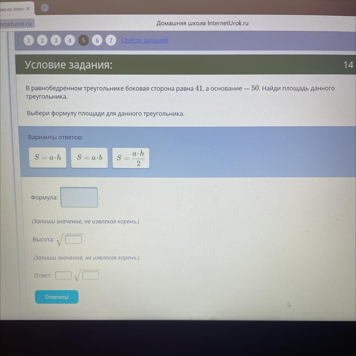 для того, чтобы найти площадь мы искали высоту, а т.к. это равнобедренный треугольник, то высота будет стоять на основании под углом 90°, считаем по теореме Пифагора высоту и находим площадь по формуле