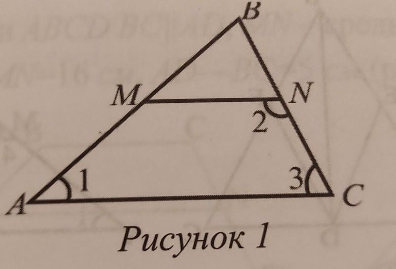 В трикутнику ABC, якщо MN є середньою лінією і кут 3 ділиться на кут 2 у відношенні 1:2, то це означає, що кут 3 є подвійним кутом 2. Тобто, кут 3 = 2 * кут 2.