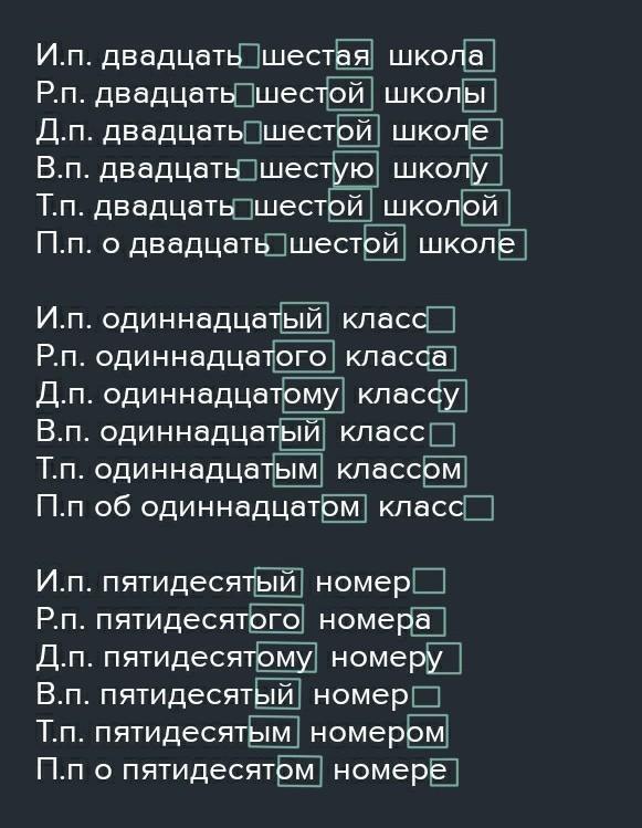 помогите пжж,нужно просклонять слова по падежам:двадцать шестая школа,одиннадцатый класс,пятидесятый номер,и выделить окончания