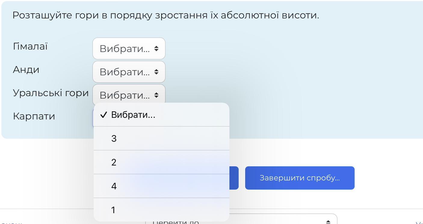 Розташуйте гори в порядку зростання їх абсолютної висоти.