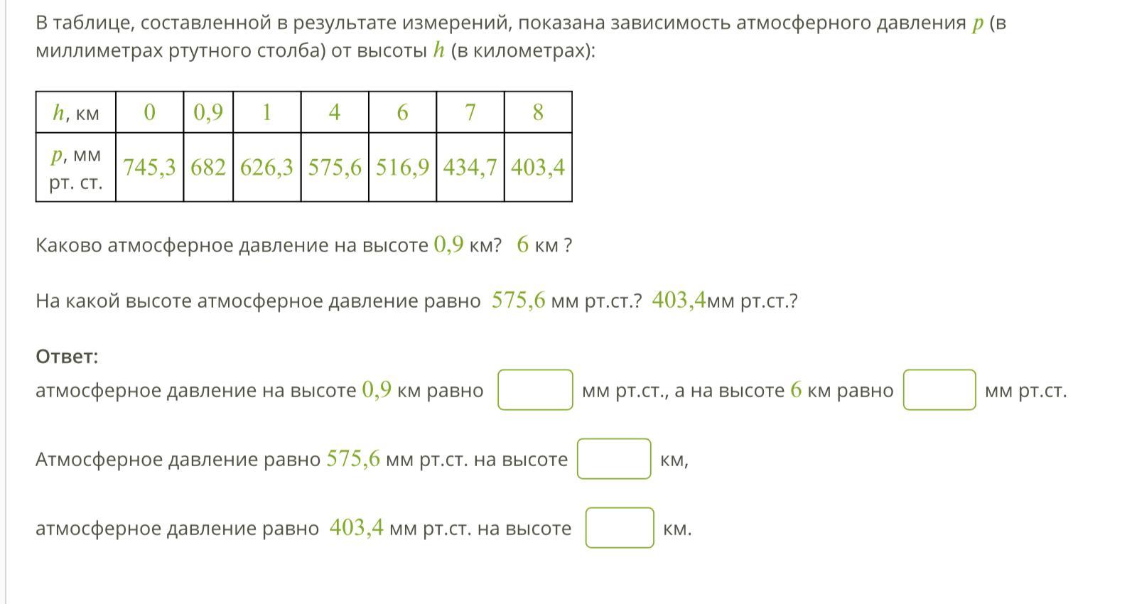 Ответ:682 мм рт. ст., 516.9мм рт. ст., 4 км, 8 км.