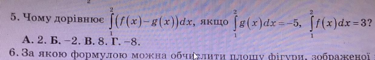 чому дорівнює (2) інтеграл(1) f(x)dx, якщо (2)інтеграл(1)f(x)dx=-5, (2)інтеграл(1) f(x)dx=3?