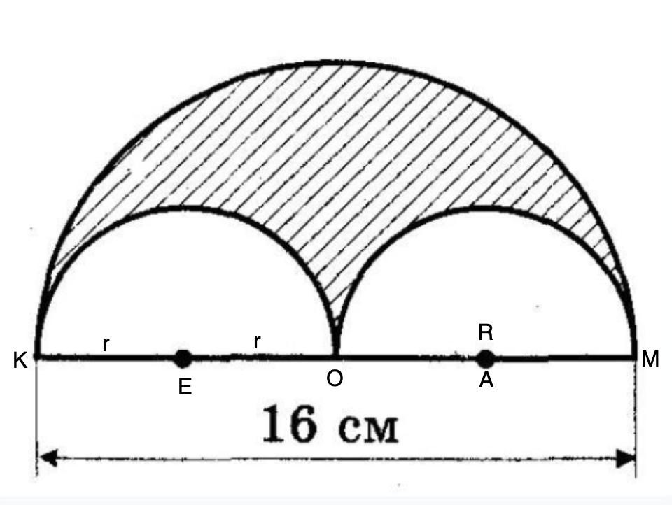 Чтобы найти площадь заштрихованной фигуры, надо от площади полуокружности (О, R) вычесть площади полуокружности (Е, r) и полуокружности (А, r).