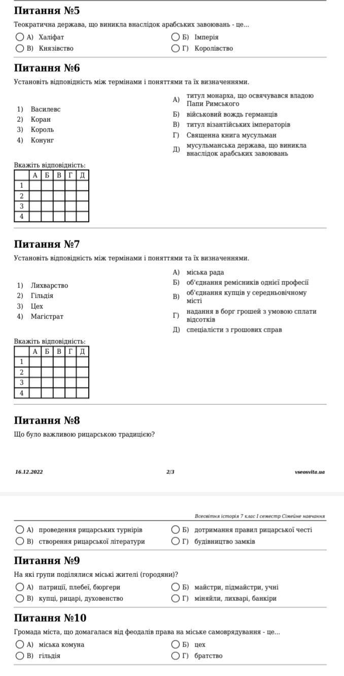 - 7-1)Лихварство-Г)надання в борг грошей з умовою сплати відсотків,2)Гільдія-В) об'єднання купців у середньовічному місті,3)Цех-Б)об'єднання ремісників однієї професії,4)Магістрат-А)міська рада
