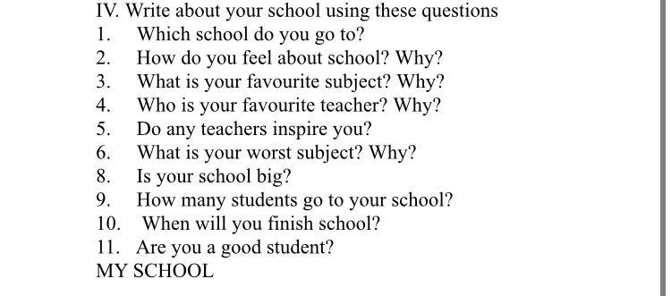 Написати на англ твір питання по яким треба писати там є , я хороший студент , в школу ходить багато дітей , кароче писати про мене тільки хороше) даю 100 балів школа у мен середня якщо є питання , задавайте