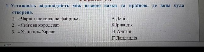 ДАЮ 100 БАЛОВ 1. «Чарлі і шоколадна фабрика>> 2. «Снігова королева» 3. «Хлопчик- Зірка>> відповідність мiж назвою казки та краïною, де вона була А Дапія Б Ірландія В Англія Г Лапландія