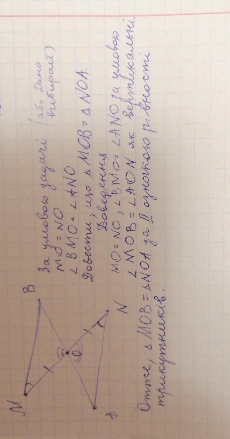 1. Відрізки MN і AB перетинаються в точці O, яка є серединою відрізка MN. ∠BMO=∠ANO. Доведіть, що ∆MOB=∆NOA.