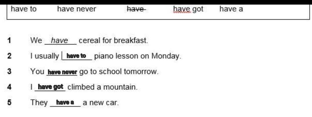 Объяснение: 2 - have a, 3 - have to, 4 - have never, 5 - have got