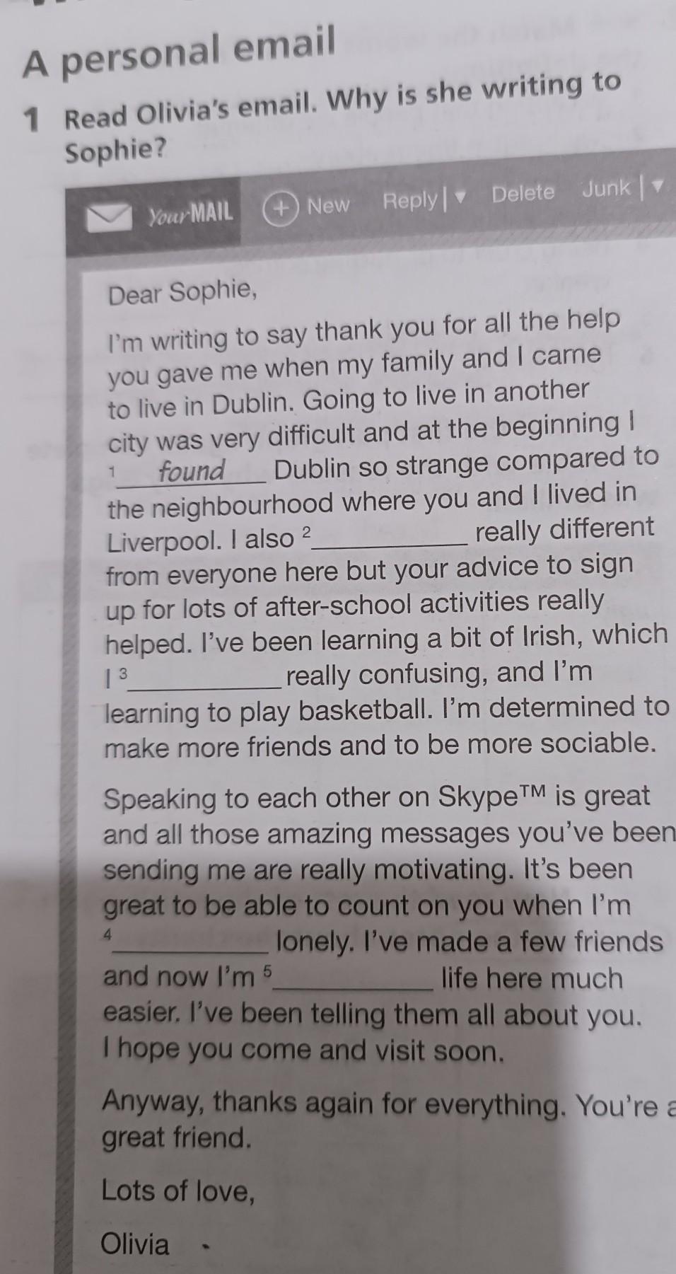 A personal email 1 Read Olivia's email. Why is she writing to Sophie?