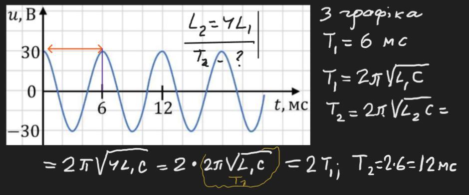 На рисунку подано графік залежності напруги від часу в коливальному контурі під час вільних коливань. Визначте, яким стане період коливань, якщо індуктивність збільшити в 4 рази.