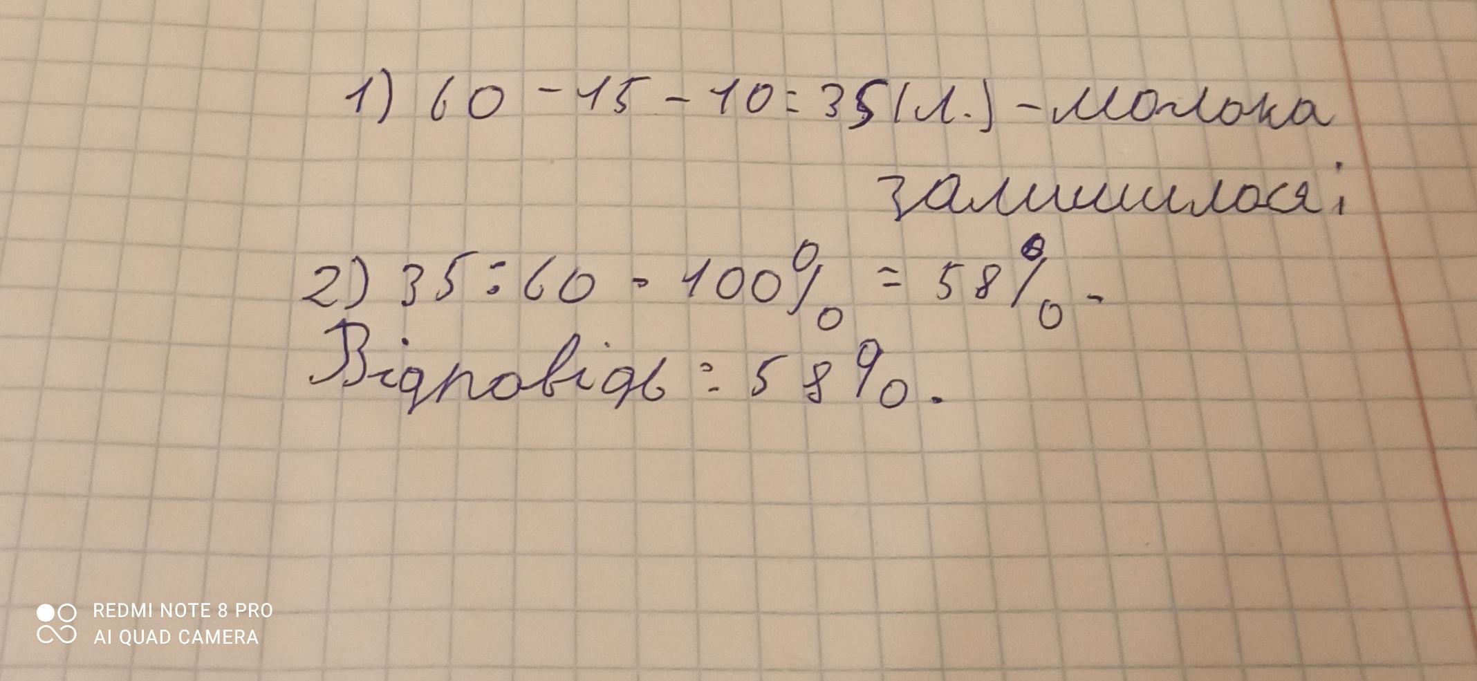 Кот Матроскин надоил 60 л молока. Из 15 л он заквасил сметану, ещё из 10 л сделал кефир. Остальное решил продать. Сколько процентов молока осталось у Матроскина на продажу?
