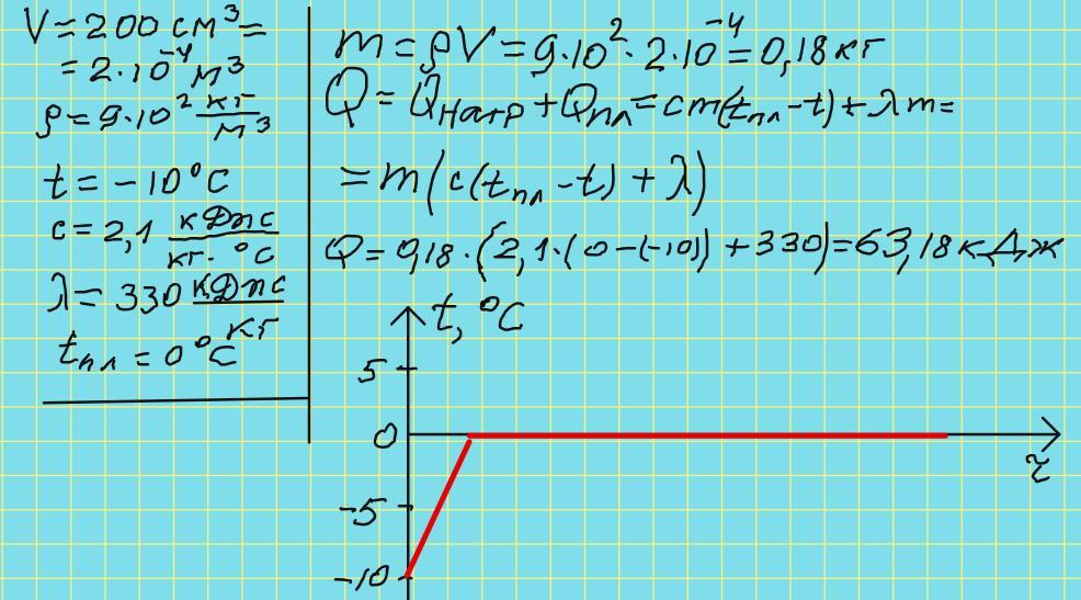 Яка кількість теплоти витрачається на плавлення 200 см³ льоду, узятого за температури -10°C? Зобразити процеси на графіку залежності температури від часу. (Питома теплота плавлення льоду 330 кДж/кг, питома теплоємність 2100 Дж/(кг°С), густина 900 кг/м³.)