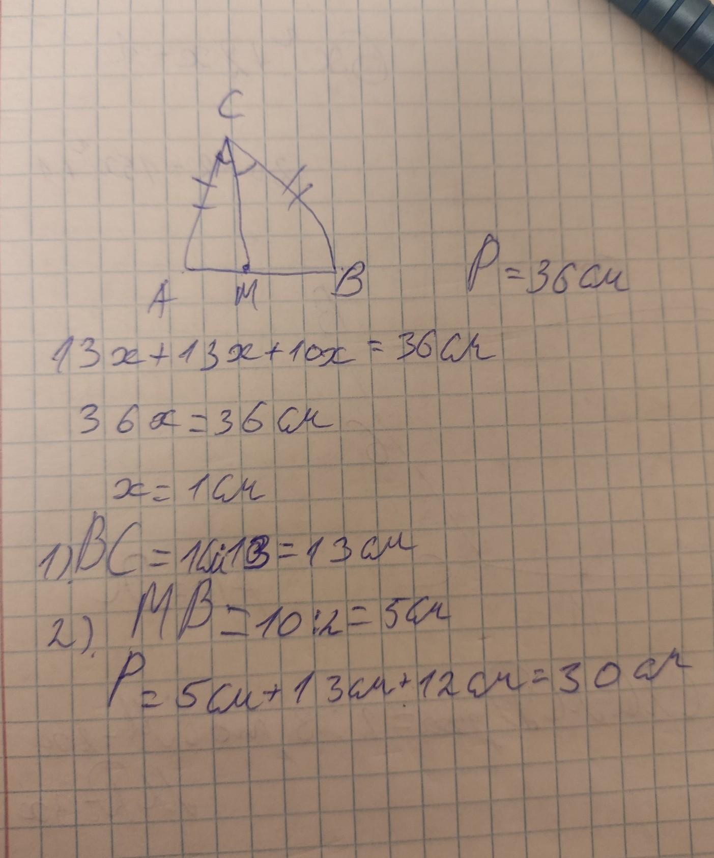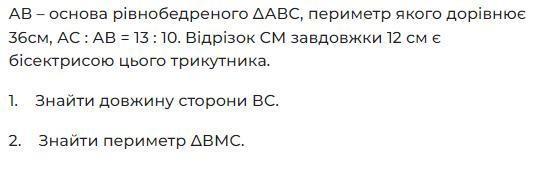 АВ – основа рівнобедреного ∆АВС, периметр якого дорівнює 36см, АС : АВ = 13 : 10. Відрізок СМ завдовжки 12 см є бісектрисою цього трикутника.