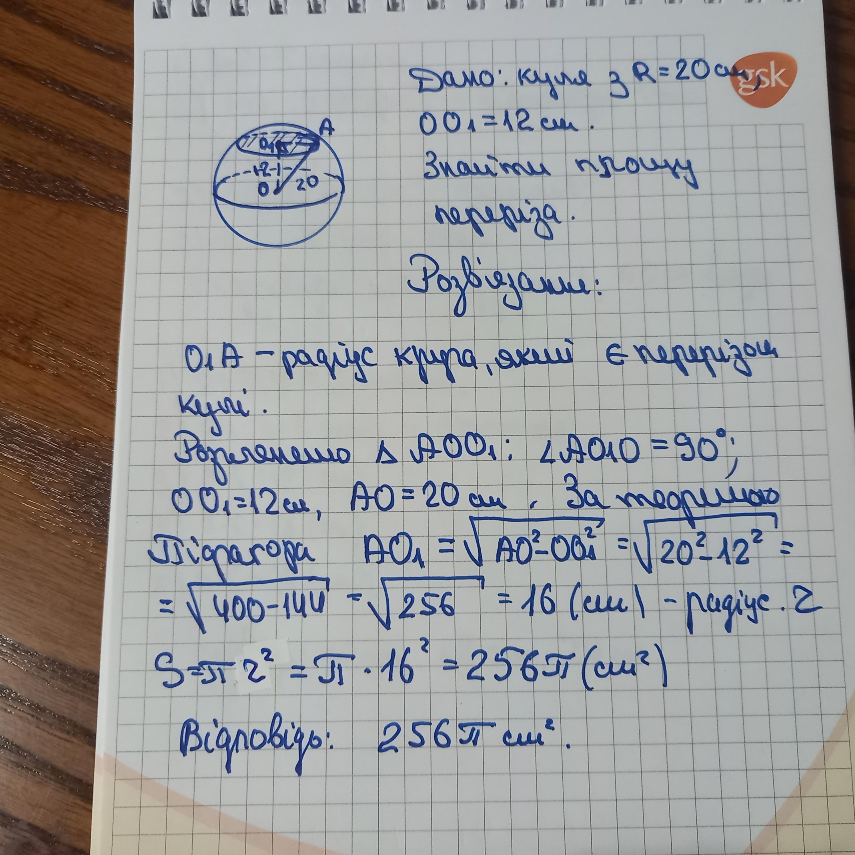 Кулю перетнуто площиною на відстані 12 см від її центра. Знайдіть площу цього перерізу, якщо радіус кулі дорівнює 20 см.