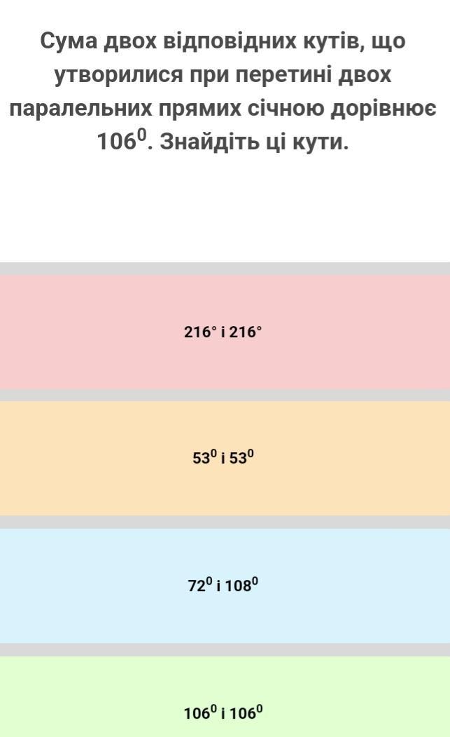 Відповідні кути при паралельних прямих січною рівні між собою.