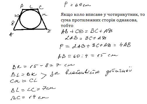 Коло, вписане в рівнобічну трапецію, поділяє точкою дотику бічну сторону на відрізки, довжина більшого з яких дорівнює 8 см. Знайдіть меншу основу трапеції, якщо її периметр дорівнює 60 см.