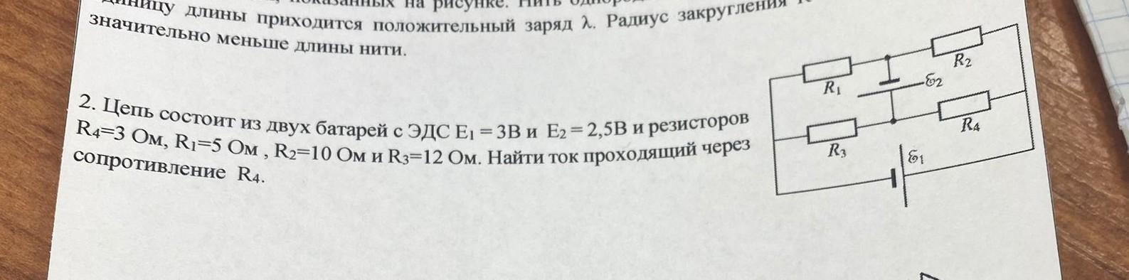 Цепь состоит из двух батарей с ЭДС Е1 = 3В и Е2 = 2,5B и резисторов R4=3 Ом, R1=5 Ом, R2=10 Ом и R3=12 Ом. Найти ток проходящий через сопротивление R4.