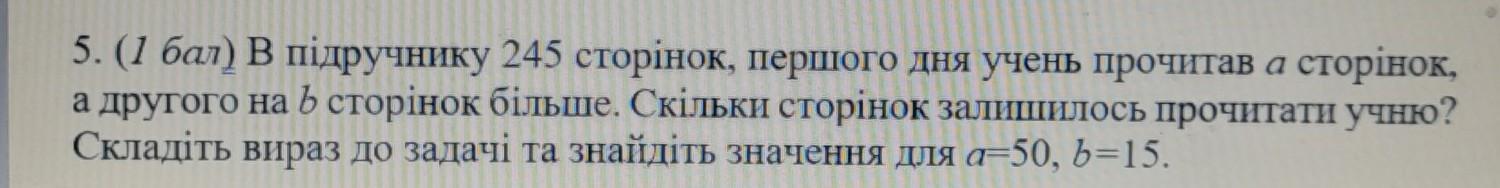 В підручнику 245 сторінок, першого дня учень прочитав а сторінок, а другого на ь сторінок більше. Скільки сторінок залишилось прочитати учню? Складіть вираз до задачi та знайдiть значення для а-50, b=15.