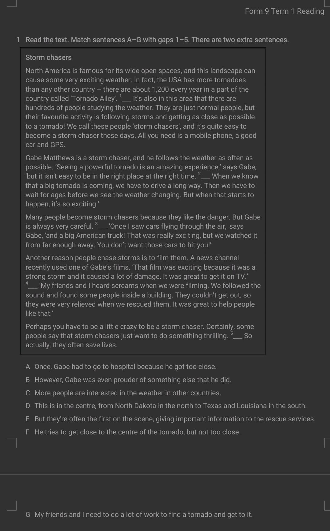Охотники за штормами Северная Америка славится своими широкими просторами, и этот пейзаж может стать причиной очень захватывающей погоды. На самом деле, в США больше торнадо, чем в любой другой стране их ежегодно - происходит около 1200 в части страны, называемой "Аллея помидоров". Это в центре, от Северной Дакоты на севере до Техаса и Луизианы на юге.. (1) Они обычные люди, но их любимое занятие следовать за штормами и подбираться как можно ближе к торнадо! Мы называем таких людей «охотниками за штормами», и в наши дни довольно легко стать охотниками за штормами. (2_) ) Гейб Мэтьюз охотник за штормами, и он следит за погодой как можно чаще. «Увидеть мощный торнадо