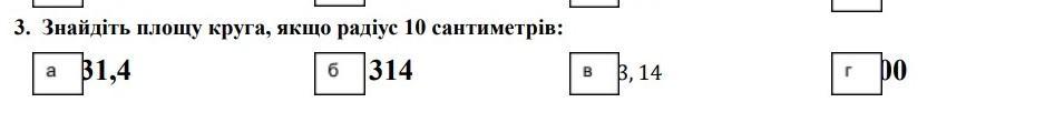 Площа S = πR² = π*10² см² ≈ 3.14 * 100 = 314 см²
