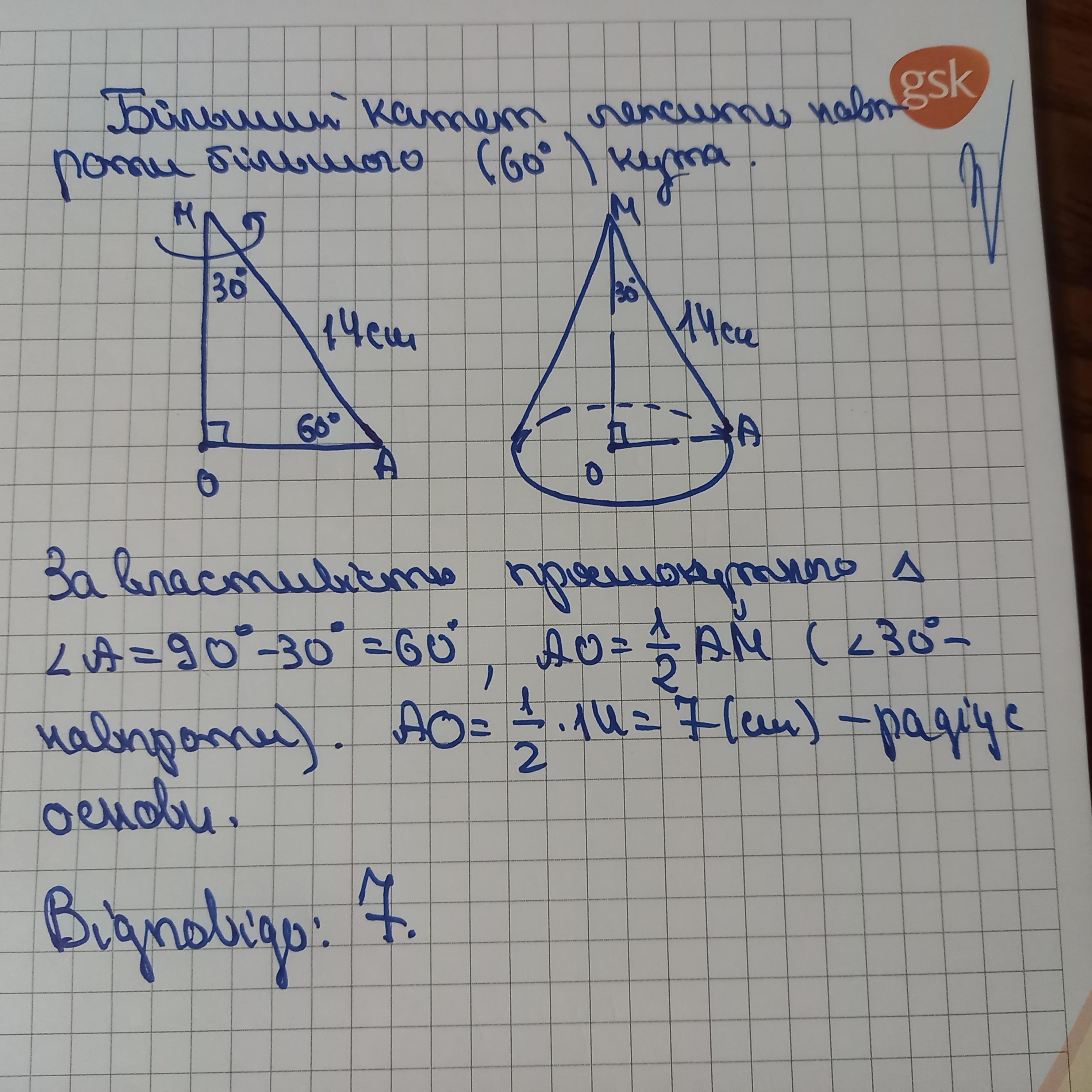 Прямокутний трикутник, з гіпотенузою 14 см та гострим кутом 30º, обертається навколо більшого катета. Знайдіть радіус основи утвореного конуса. У відповідь запишіть лише число.