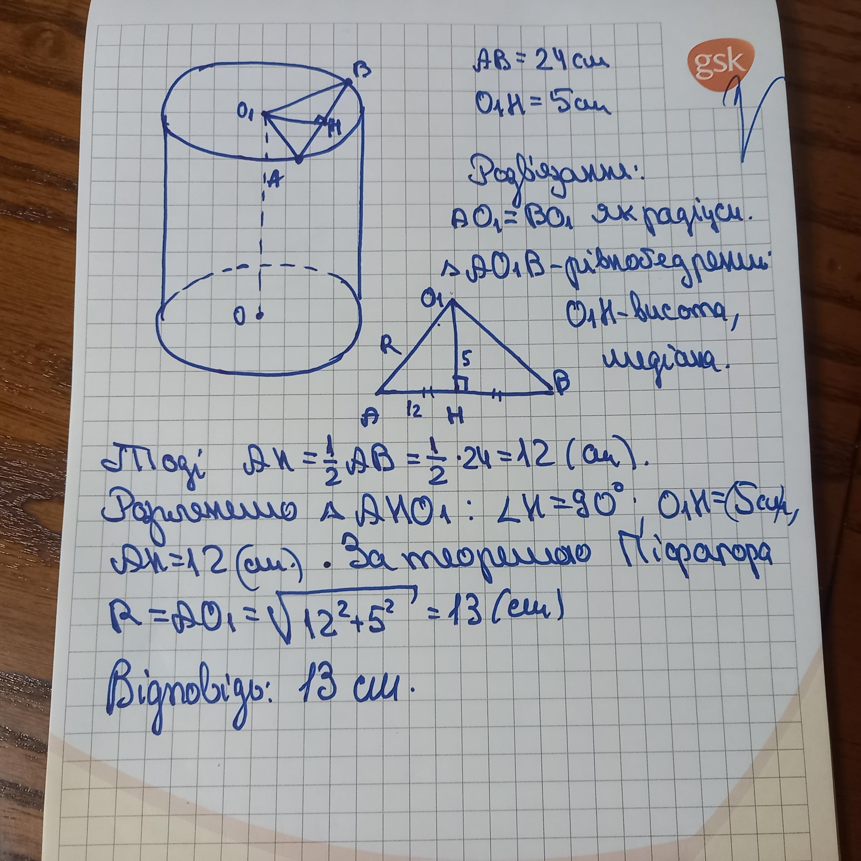 У верхній основі циліндра проведено хорду завдовжки 24 см, яка розміщена на відстані 5 см від центра цієї основи. Обчисліть радіус циліндра. У відповідь запишіть лише число.