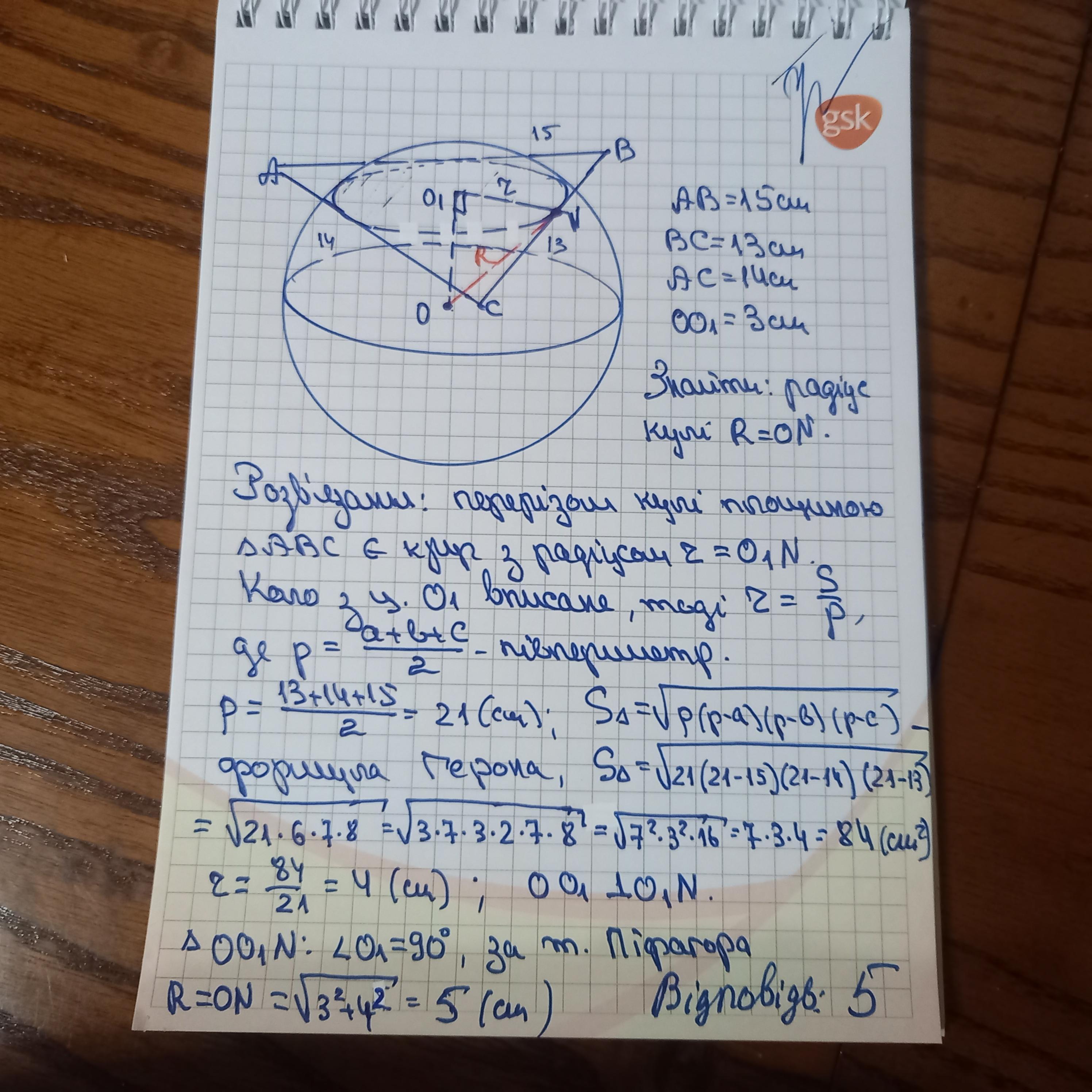 2) Сторони трикутника 13 см, 14 см, 15см. Знайдіть радіус кулі, яка дотикається до всіх сторін трикутника, якщо відомо, що відстань від площини трикутника до центра кулі дорівнює 3 см. У відповідь запишіть лише число.