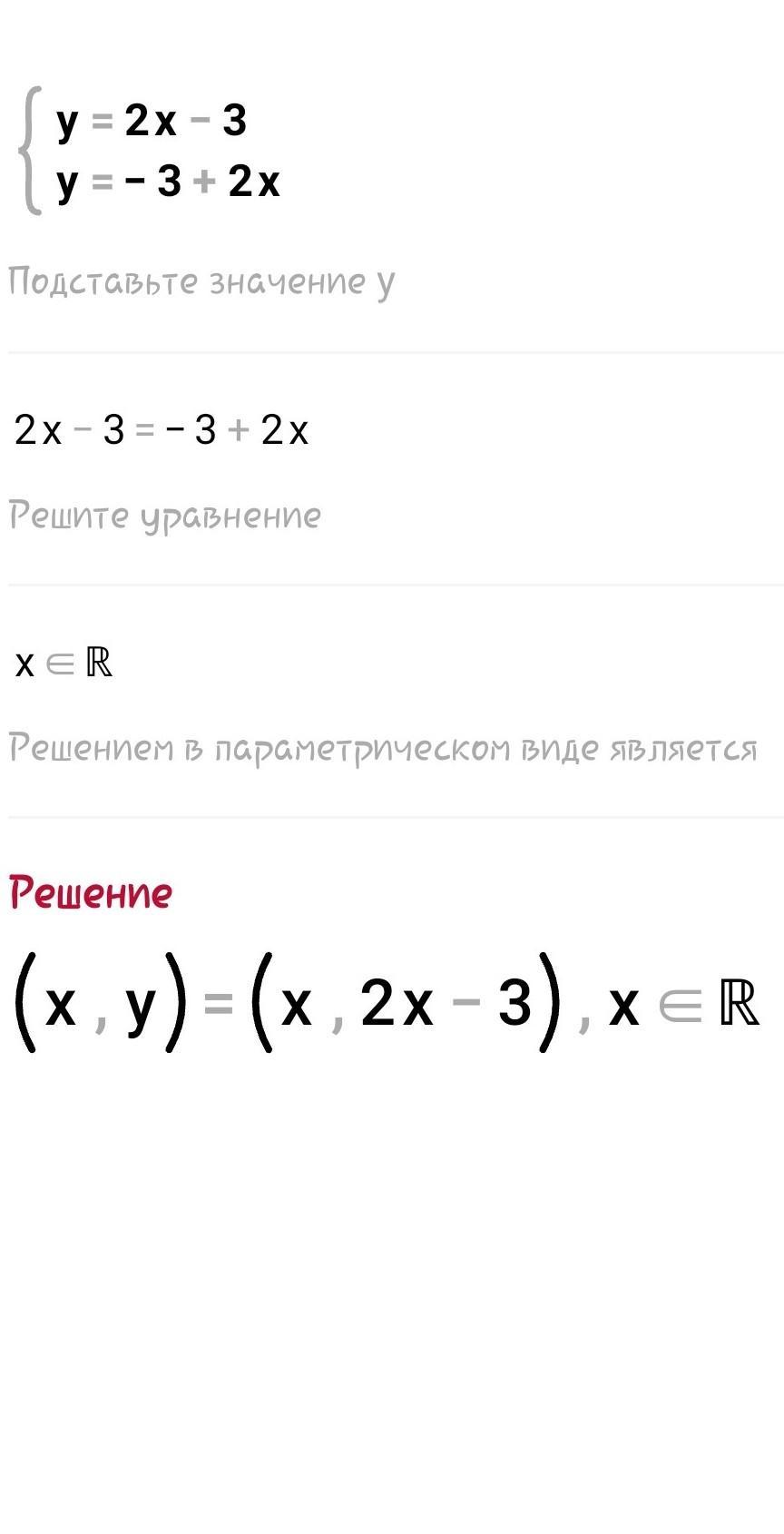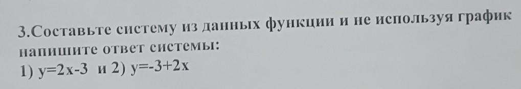 Составьте систему из данных функции и не используя график напишите ответ системы: 1) у= 2х-3 ; 2) у=-3+2х