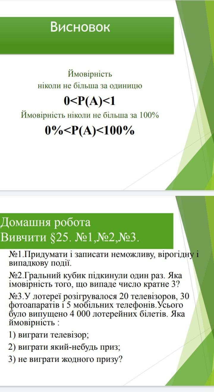 №1.Придумати і записати неможливу, вірогідну і випадкову події. №2.Гральний кубик підкинули один раз. Яка імовірність того, що випаде число кратне 3? №3. У лотереї розігрувалося 20 телевізоров, 30 фотоапаратів і 5 мобільних телефонів. Усього було випущено 4 000 лотерейних білетів. Яка ймовірність : 1) виграти телевізор; 2) виграти який-небудь приз; 3) не виграти жодного призу?