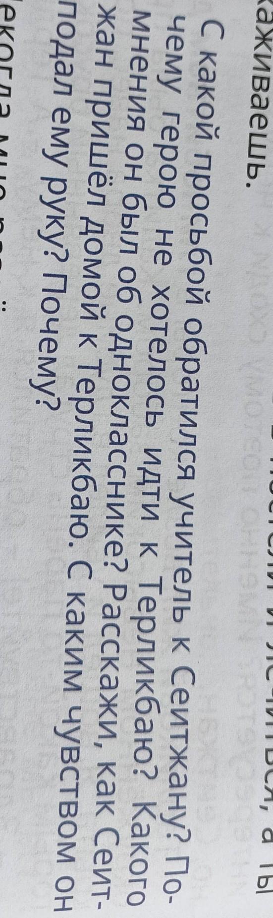 1.Сходить к однокласнику Терликбаю 2.Потому что его одноклассник был сердитым и замкнутым 3.Он был слым 4.Он прищёлкнуть к нему домой и увидел что он делал мебель