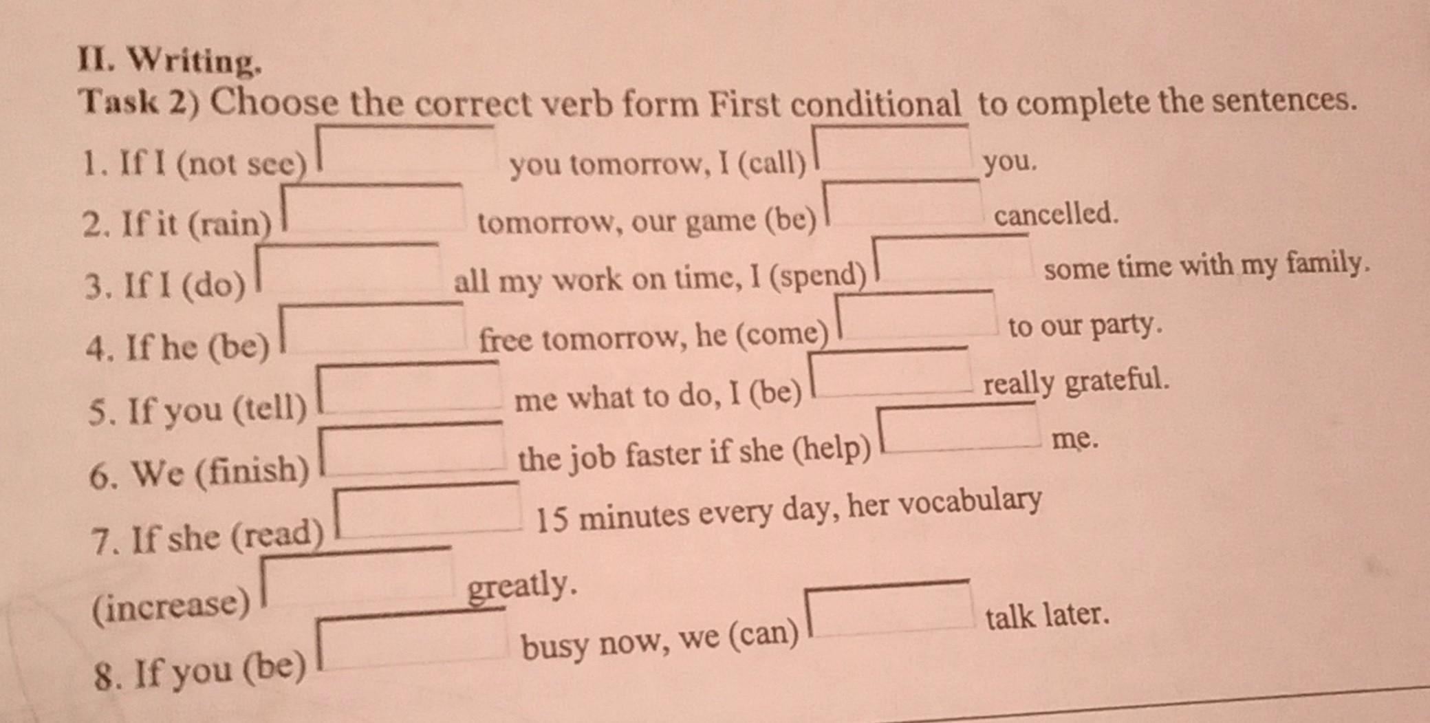 6. We'll finish the job faster if she helps me. 7.If she reads 15 minutes every day, her vocabulary will increase greatly. 8. If you are busy now, we can talk later.