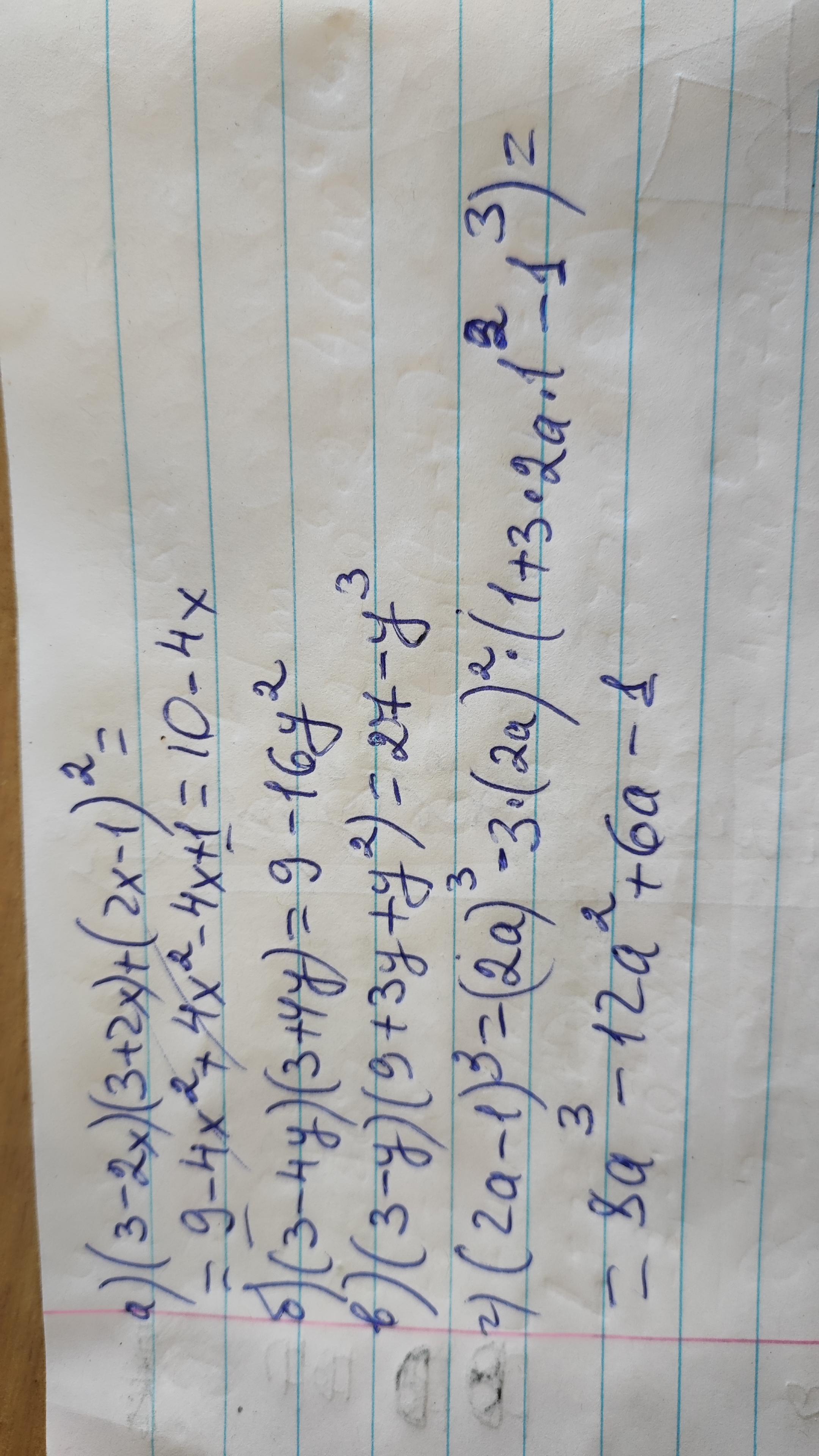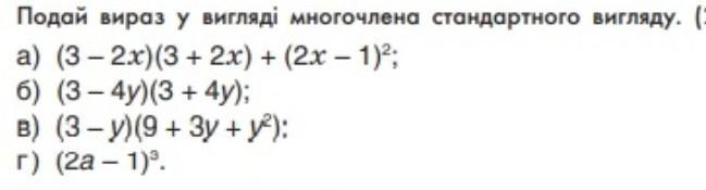 4. Подай вираз у вигляді многочлена стандартного вигляду. (2 бали) a) (3 - 2x)(3 + 2x) + (2x-1)2; 6) (3-4y) (3 + 4y); в) (3-y)(9 + 3y+y²): г) (2а - 1)3.