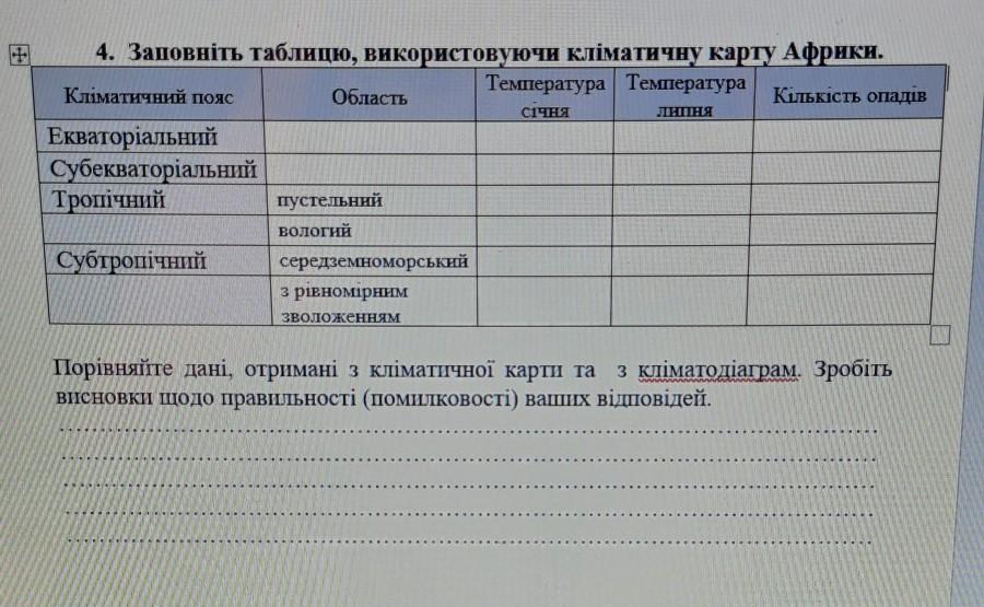 4. Заповніть таблицю, використовуючи кліматичну карту Африки. Кiлькiсть опадів Кліматичний пояс Екваторіальний Субекваторіальний Тропічний Субтропічний Область пустельний вологий середземноморський з рівномірним зволоженням Температура Температура СІЧНЯ липня пожалуйста помогите очкнь срочно