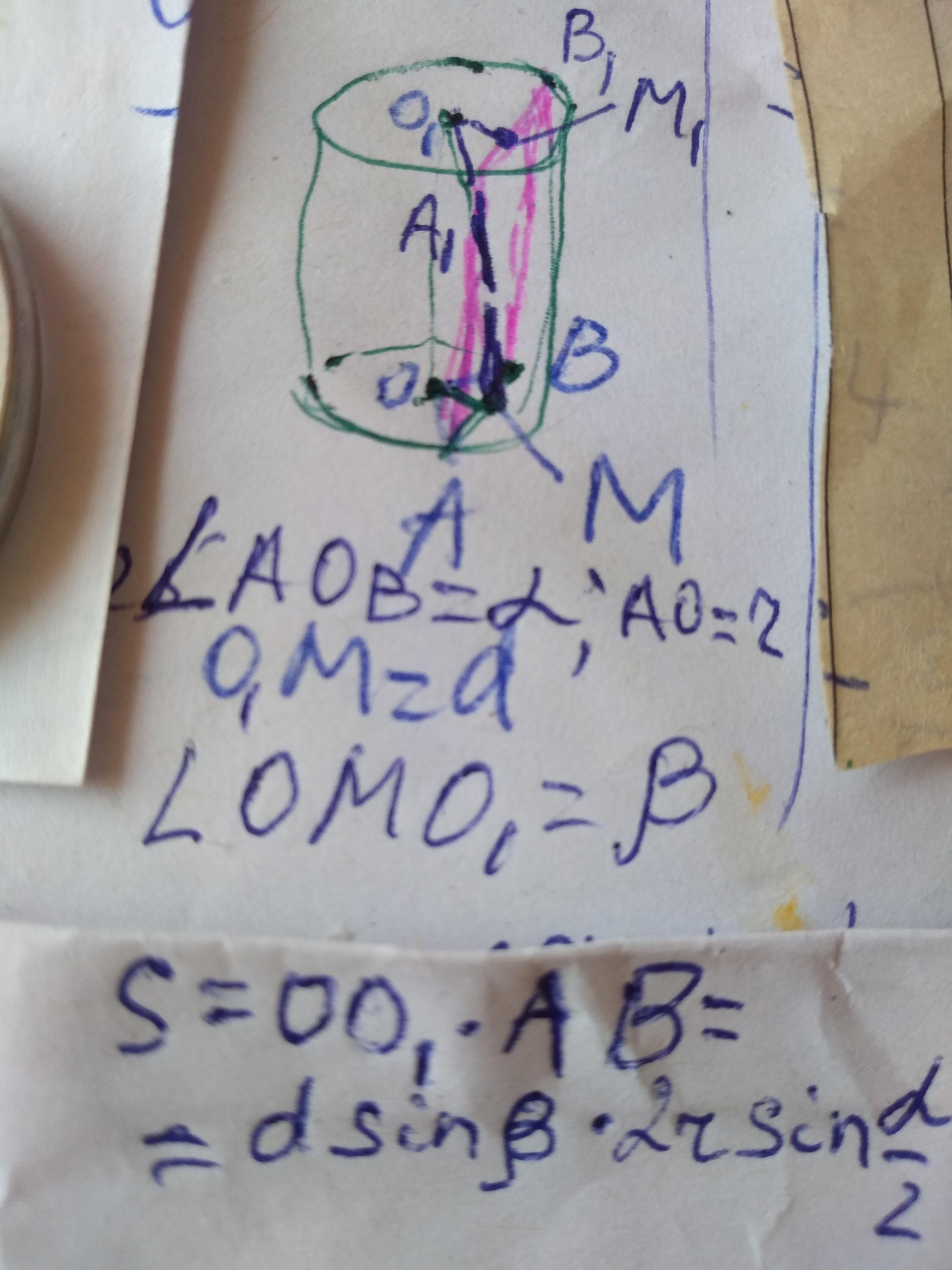 У циліндрі паралельно його осі проведено переріз, який перетинає його нижню основу по хорді, що стягує дугу, градусна міра якої дорівнює а, 0° < а < 180°. Відрізок, який сполучає центр верхньої основи та середину цієї хорди, дорівнює d і утворює з площиною основи кут В. Знайдіть площу перерізу.