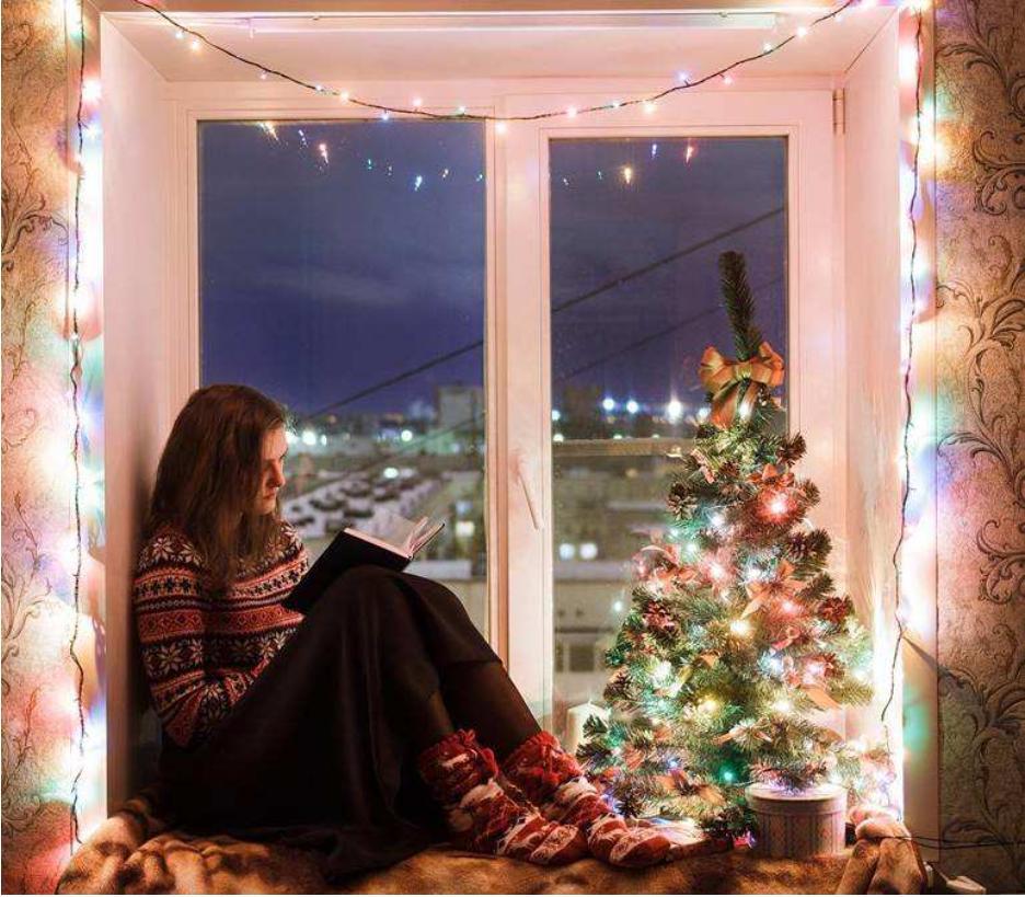 I'd like to describe the picture.It shows one interesting action.In the first step we can see one girl that reading book.In the right step,also our picture shows one crismas tree.But,this tree is so small and with colors.Our persona and tree located near the window.In the background we can see buildings.So,it gives as information what our girl lives in the higgest flour.To add more,In this room is such interesting atmosfera.Maybe,It will be calabration.Also,our persona wears some celebration clothes.It's good for winter's parties.