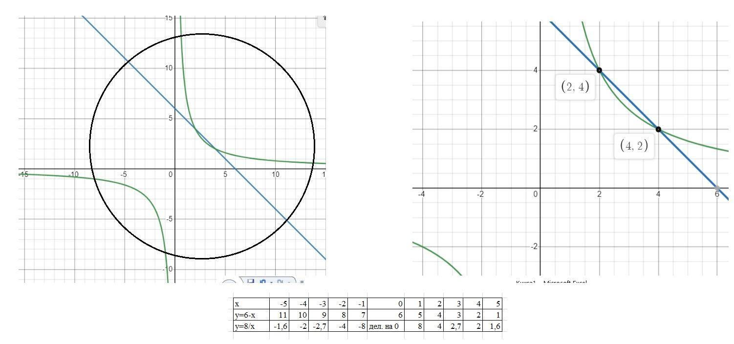 Составляем таблице значений функций при изменении значений аргумента и строим графики (См. скриншот)