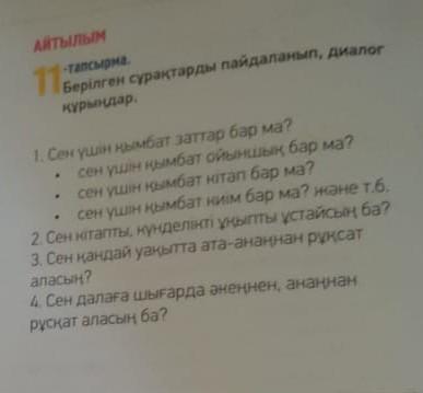 АЙТЫЛЫМ -тапсырма. 113 Берілген сұрақтарды пайдаланып, диалor курындар. 1. Сен ушiн кымбат заттар бар ма? сен ушiн кымбат ойыншык бар ма? сен ушiн кымбат кітап бар ма? сен ушiн кымбат киiм бар ма? және т.б. 2. Сен кiтапты, күнделікті уныпты устайсын ба? 3. Сен кандай уакытта ата-ананнан руксат аласын? 4. Сен далаға шыгарда аненнен, ананнан рускат апасын ба?ПОСТАВЛЮ 40 БАЛЛОВ