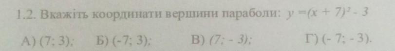 1.2. Вкажіть координати A) (7: 3); Б) (-7; 3); вершини параболи: у =(x + 7) - 3 B) (7; - 3); T) (-7; -3).
