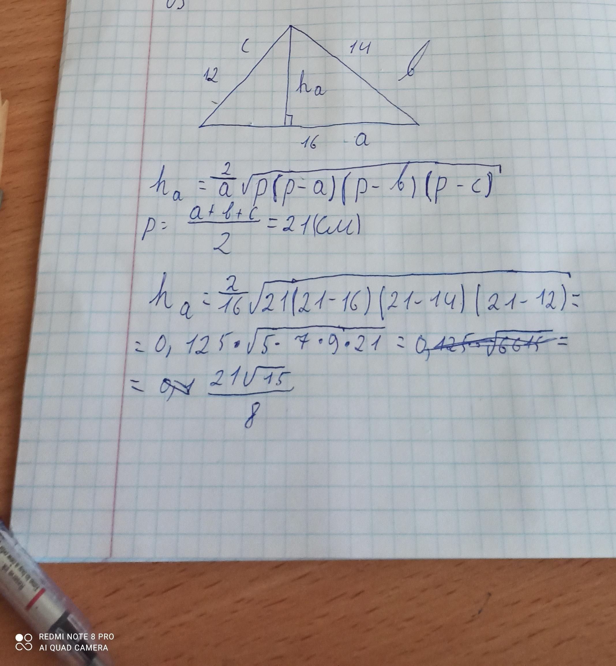 Треугольник Даны 3 стороны 12,14,16 найдите высоту проведённая к большей стороне, решите очень прошу