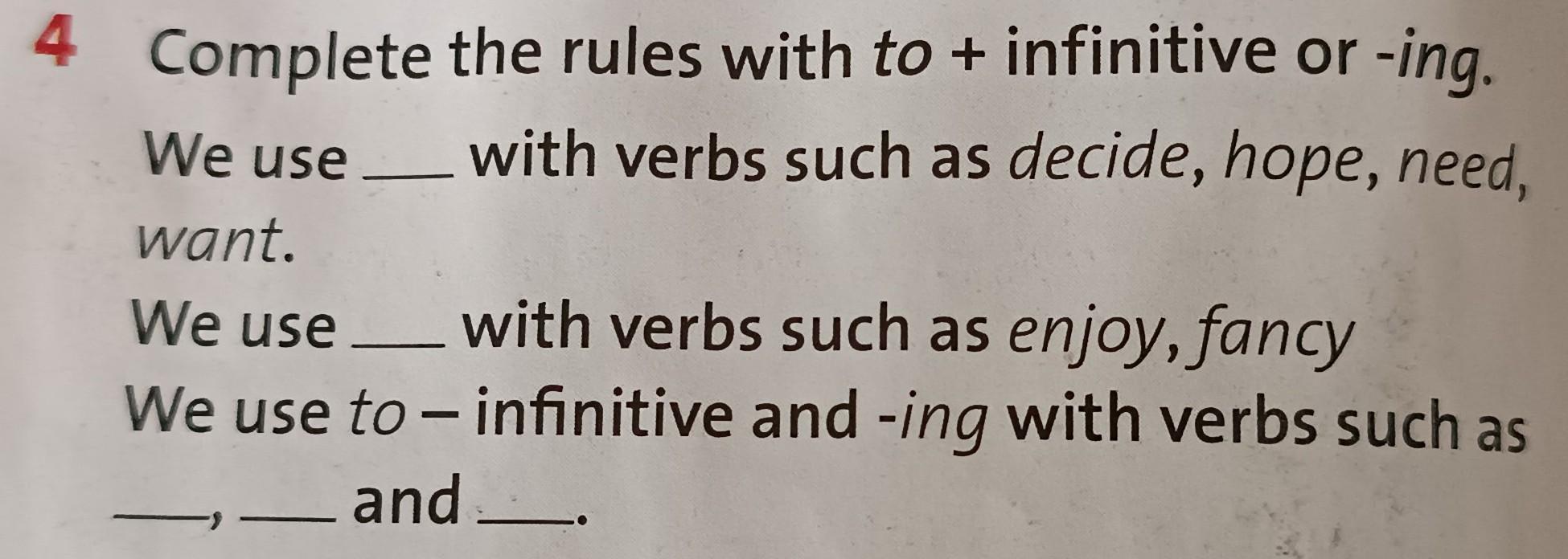 4 Complete the rules with to + infinitive or -ing. We use with verbs such as decide, hope, need, want. We use with verbs such as enjoy, fancy We use to - infinitive and -ing with verbs such as and