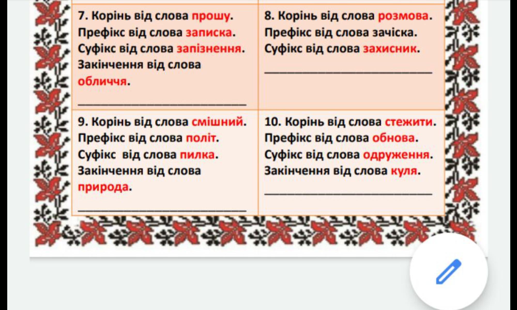 7) 1 про. 2 За. 3 енн. 4 я. 8) 1 мова. 2 Заю 3 исн. 9) 1 смішн. 2 немає. 3 к. 4 да. 10) 1 стеж. 2 немає. 3 енн. 4 я.